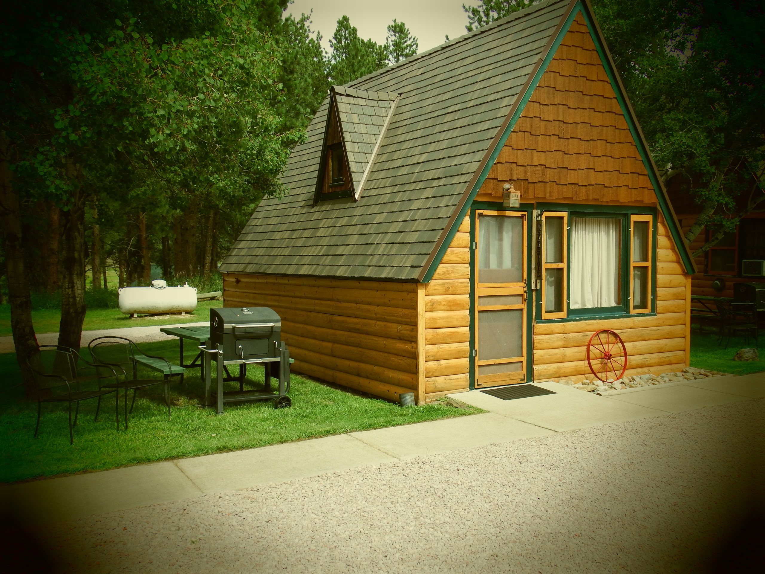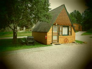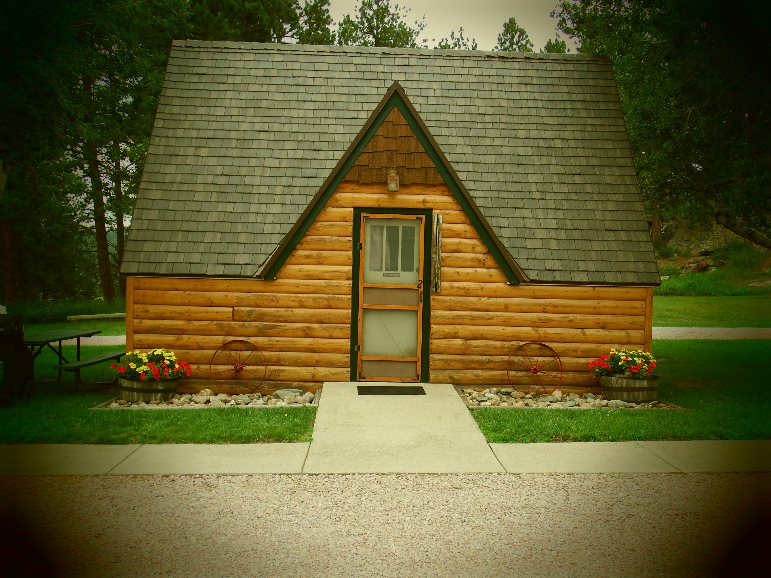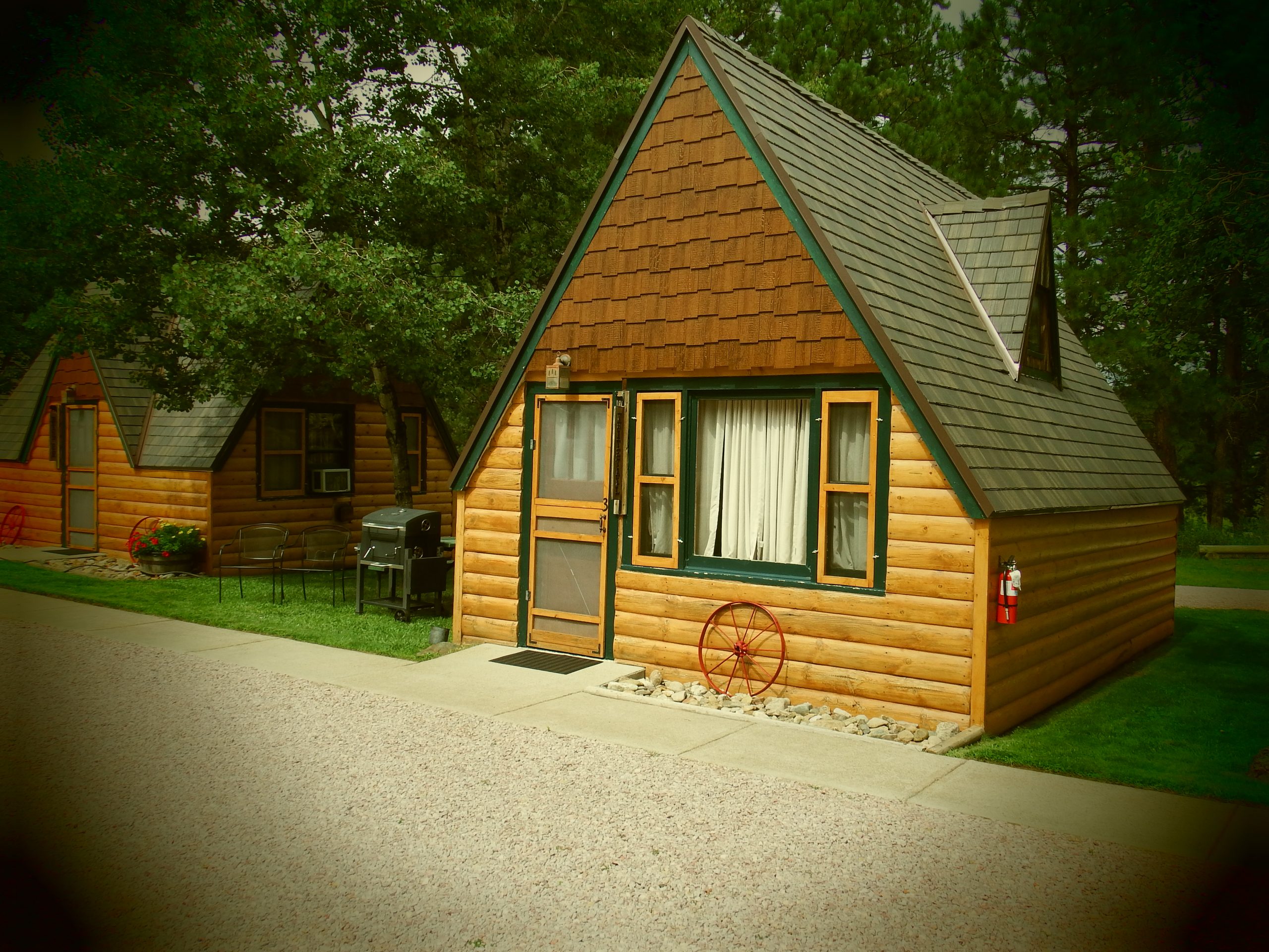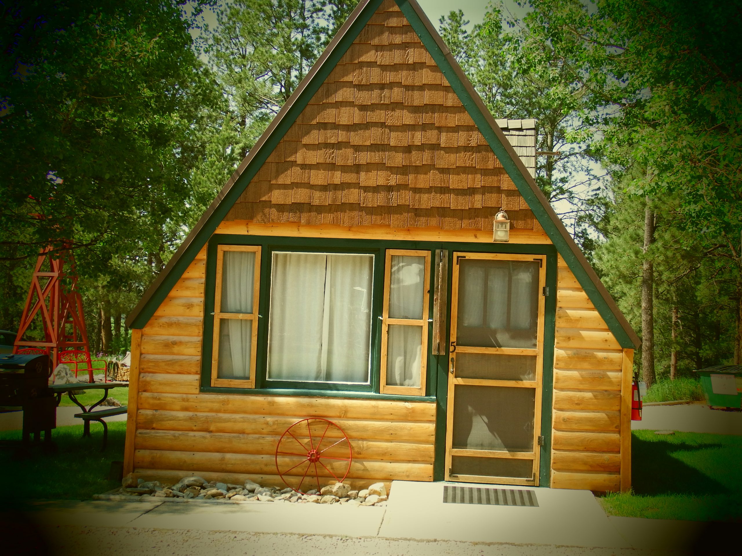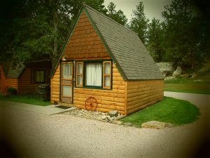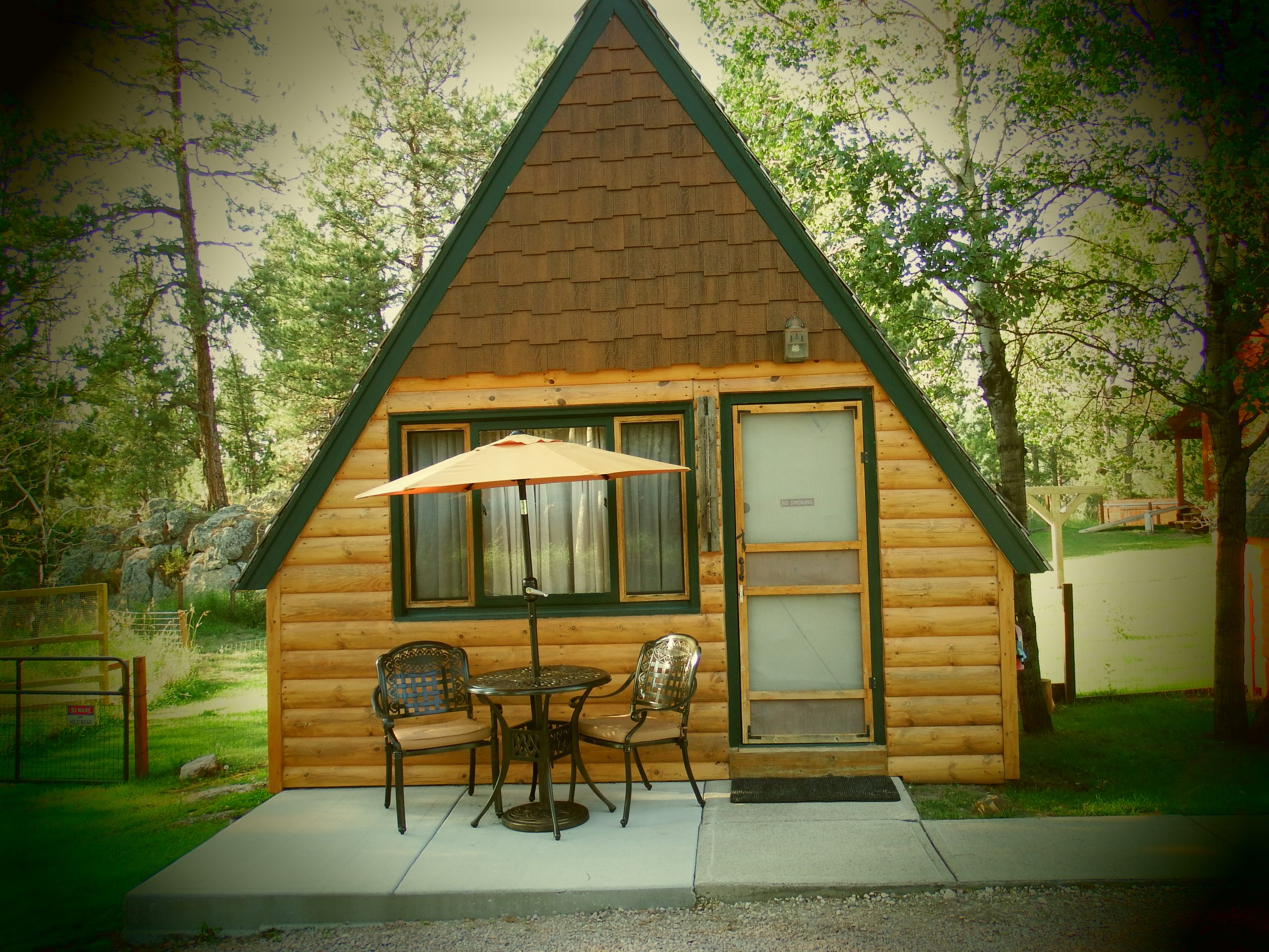 Our Rustic A-Frames, cabins 1 through 7, were constructed in the late 1940’s and early 1950’s. Just like everything in the Black Hills, these cabins have great history. All A-frame roof cabins have heat, air conditioning, color cable TV, WIFI and full baths with shower tub combos, and kitchenettes. Towels and linens are provided. A picnic table, outdoor seating with a charcoal grill are provided with each cabin. There are 4 common area fire pits (3 wood fire, 1 propane) with adirondack chairs for your enjoyment. Daily housekeeping is not provided.  NO PETS..