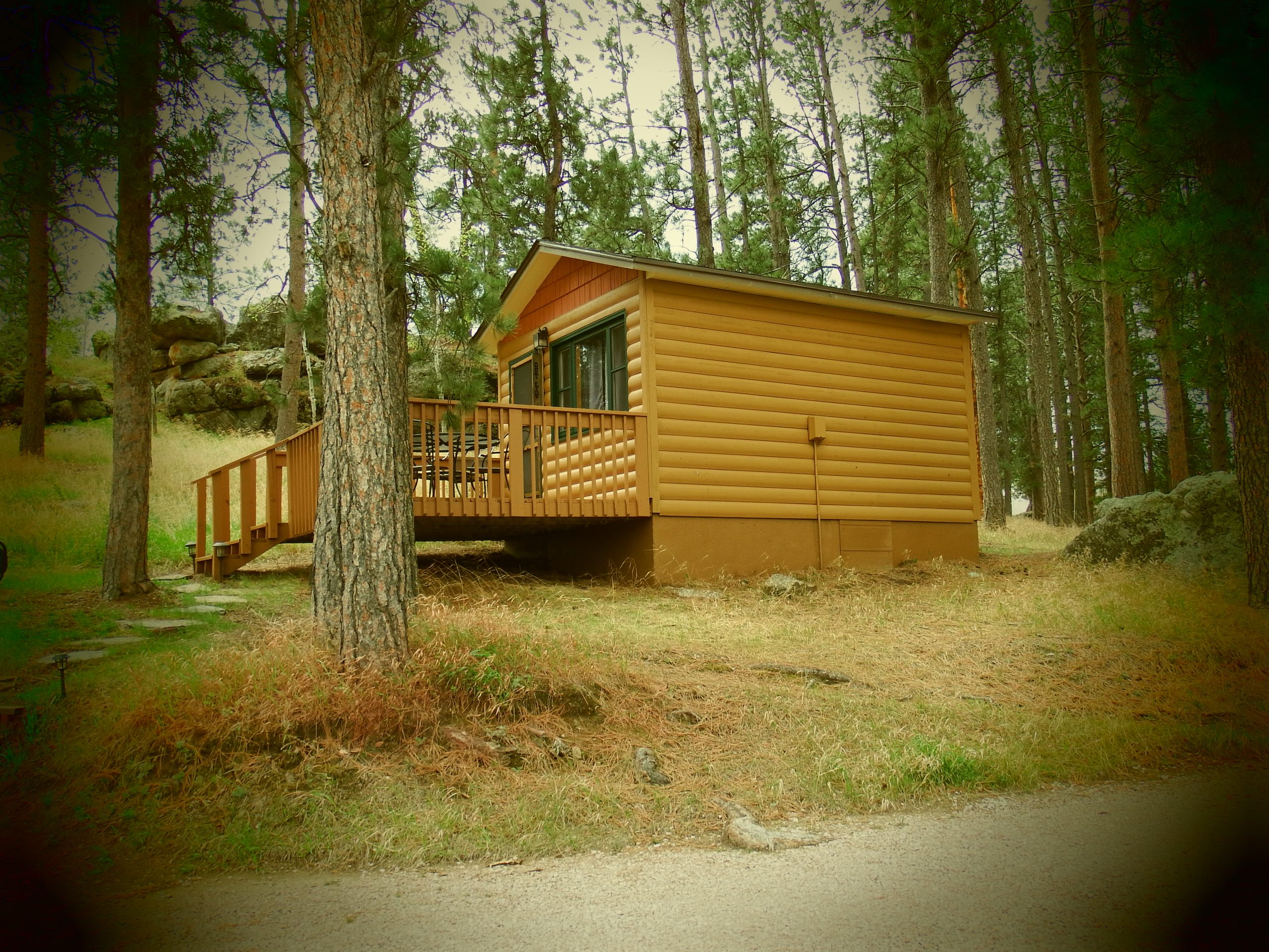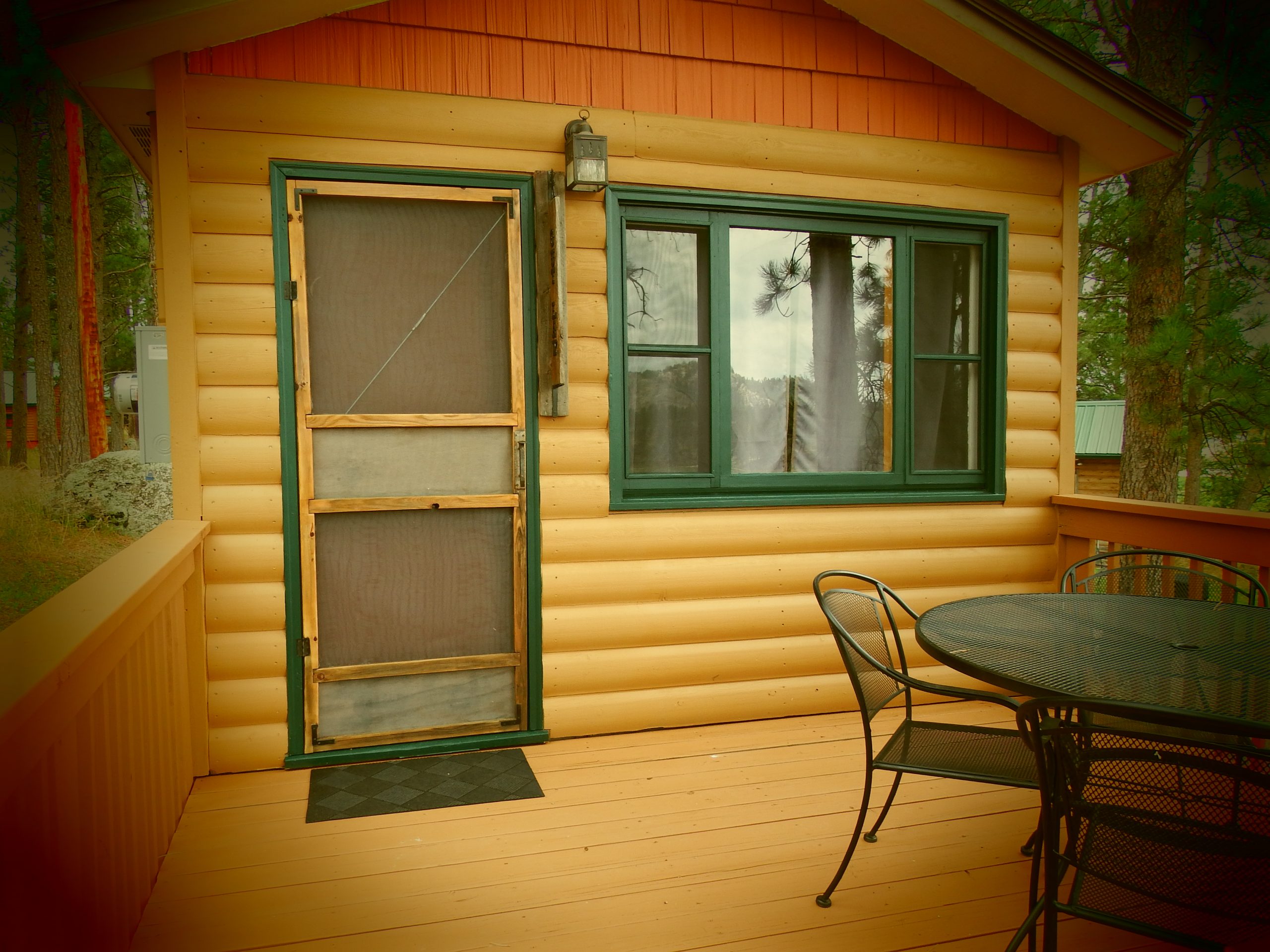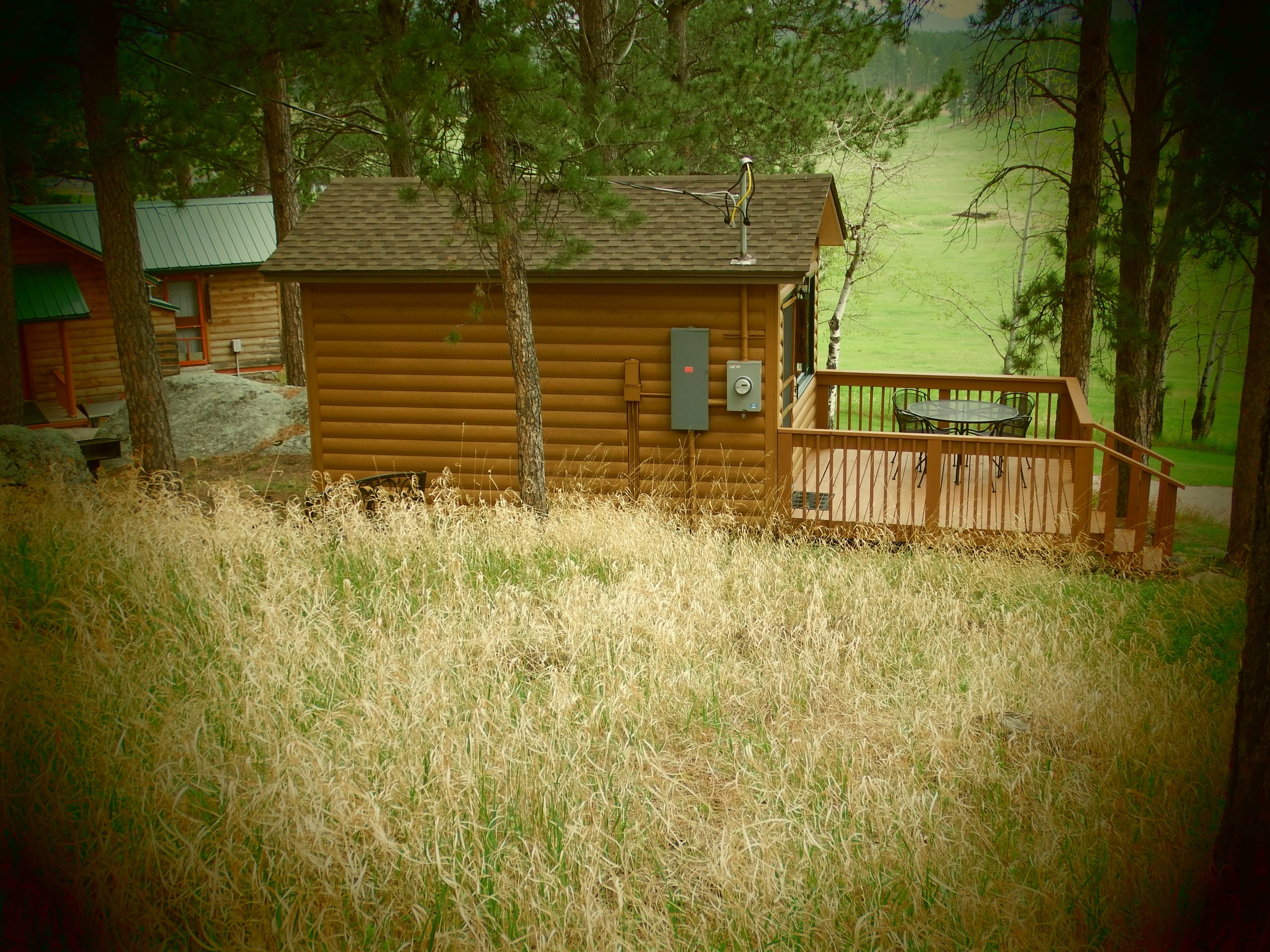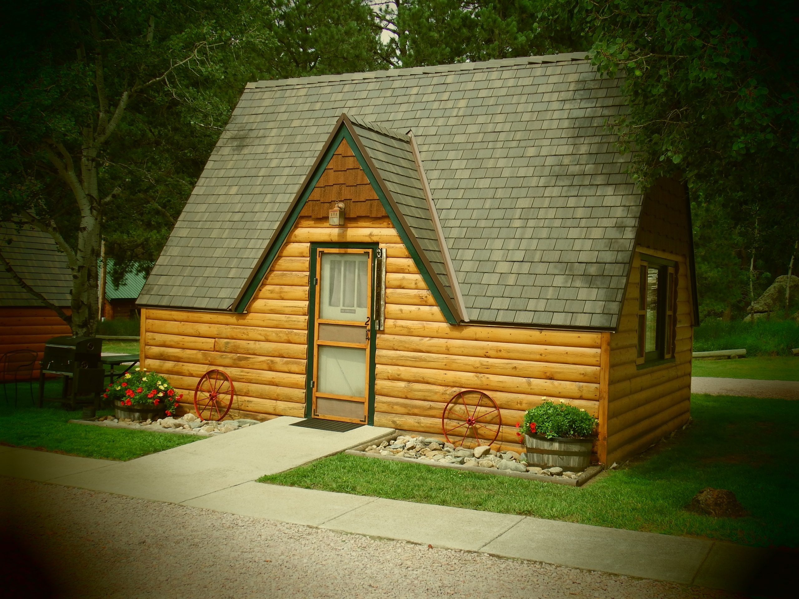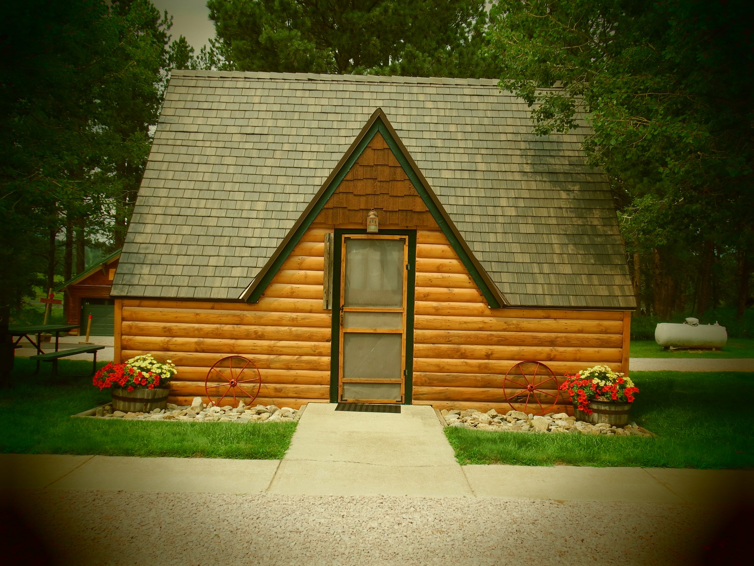 Our Rustic A-Frames, cabins 1 through 7, were constructed in the late 1940’s and early 1950’s. Just like everything in the Black Hills, these cabins have great history. All A-frame roof cabins have heat, air conditioning, color cable TV, WIFI and full baths with shower tub combos, and kitchenettes. Towels and linens are provided. A picnic table, outdoor seating with a charcoal grill are provided with each cabin. There are 4 common area fire pits (3 wood fire, 1 propane) with adirondack chairs for your enjoyment. Daily housekeeping is not provided.  NO PETS..