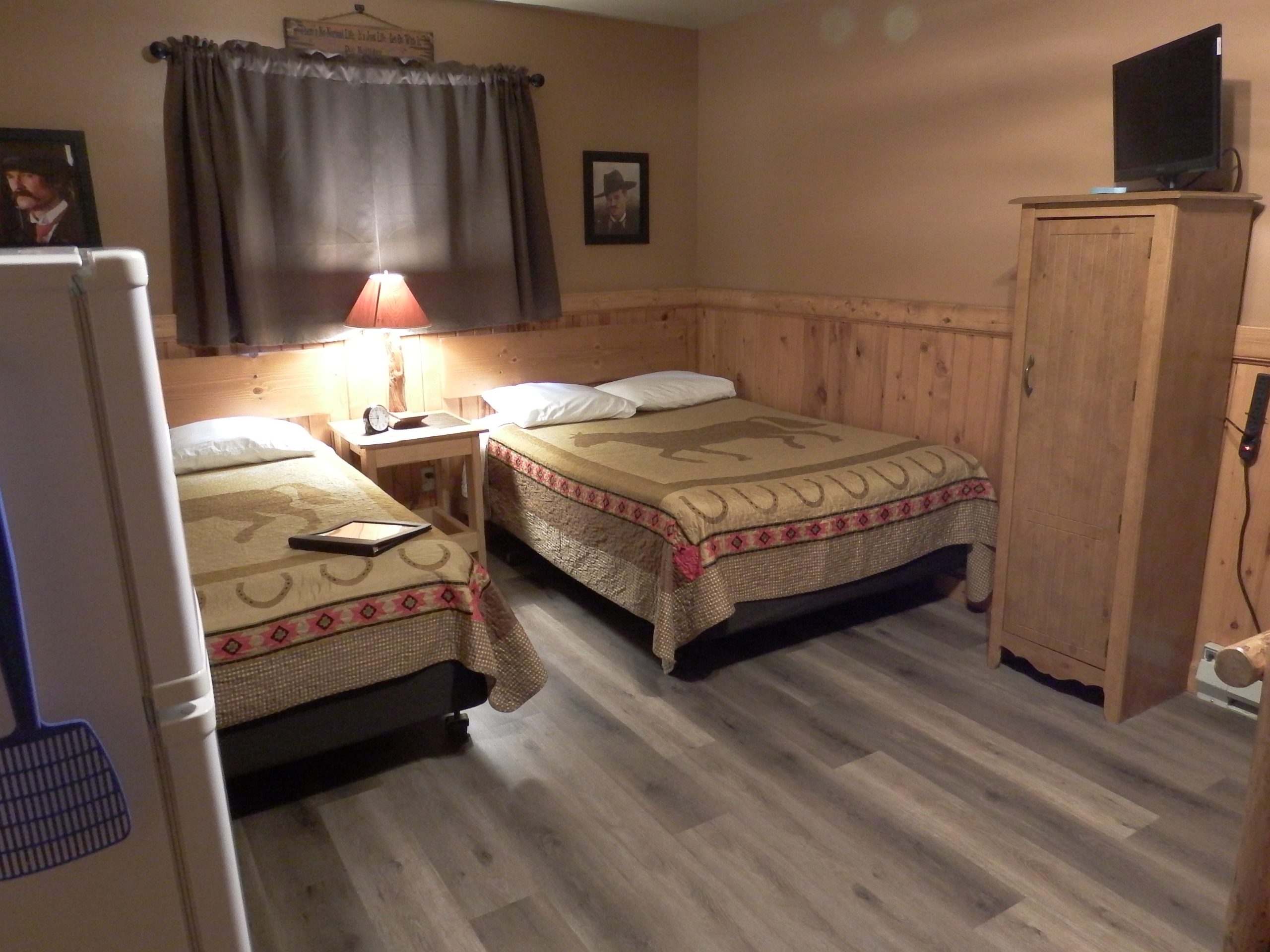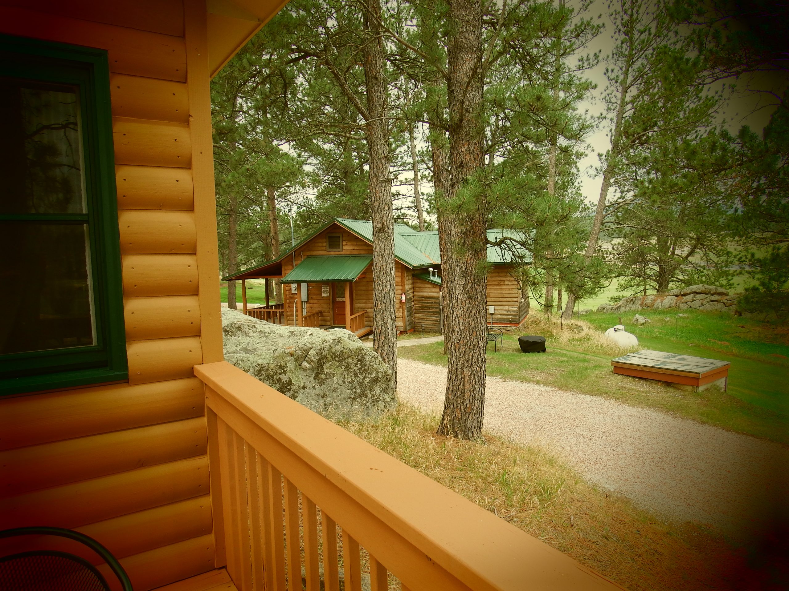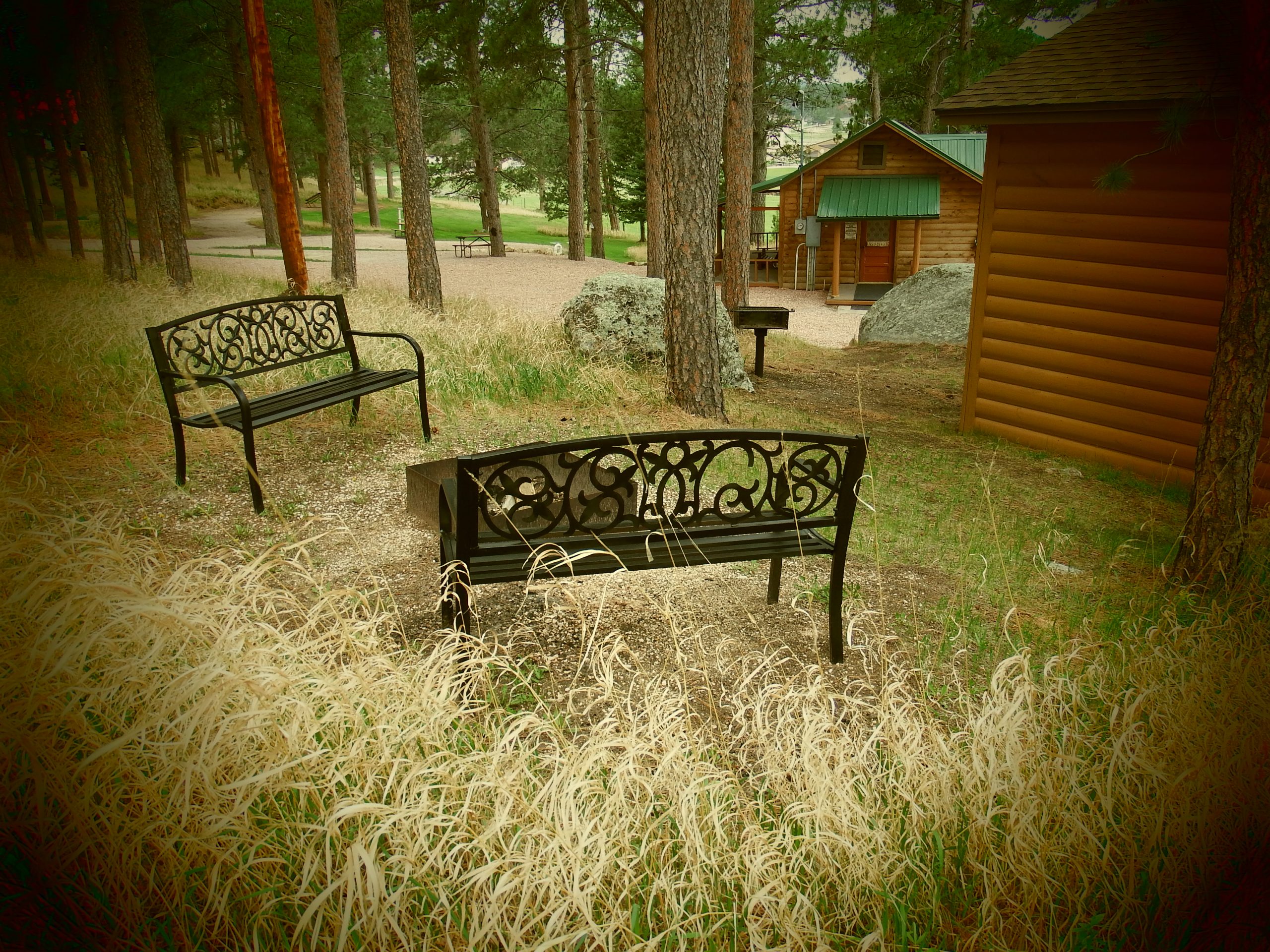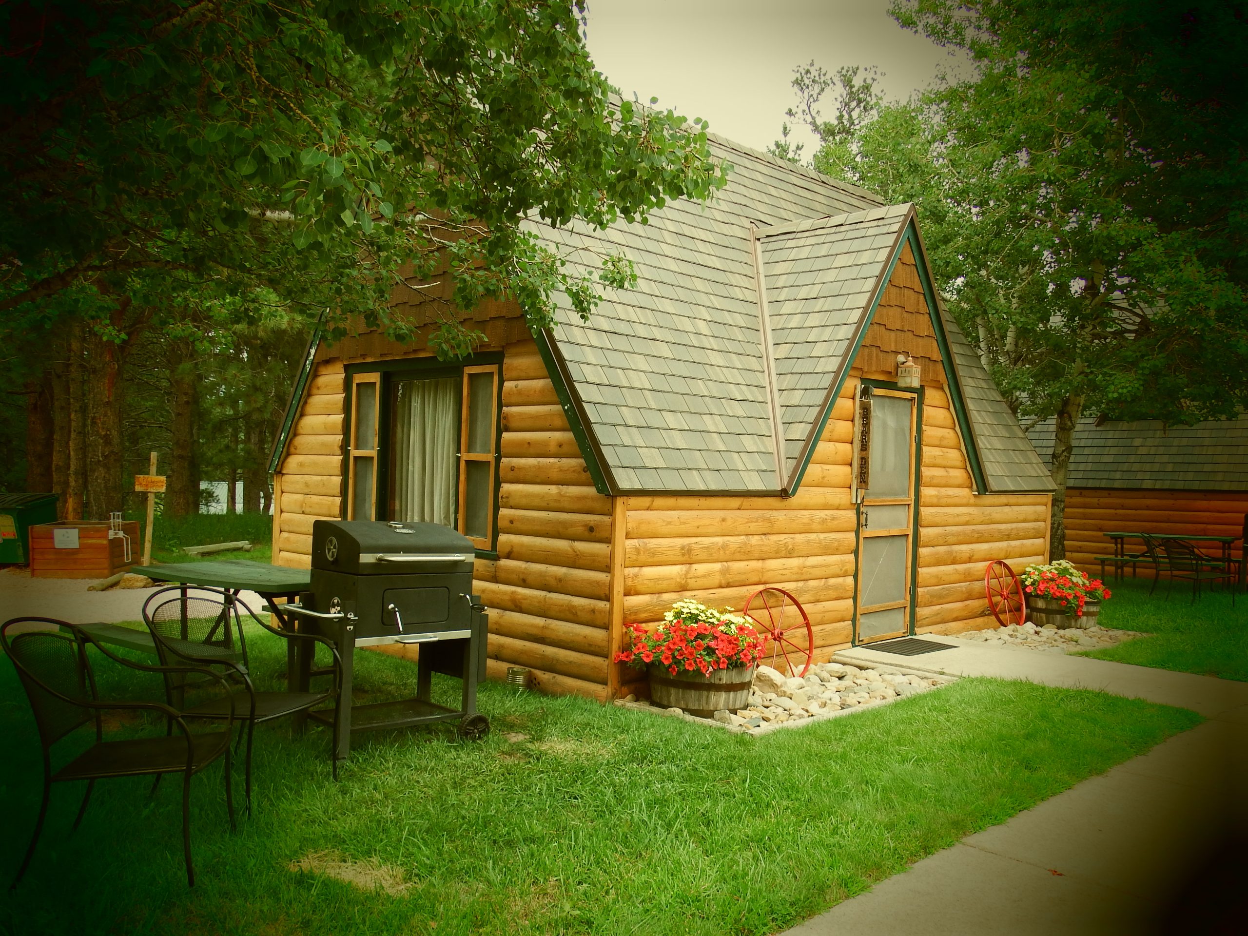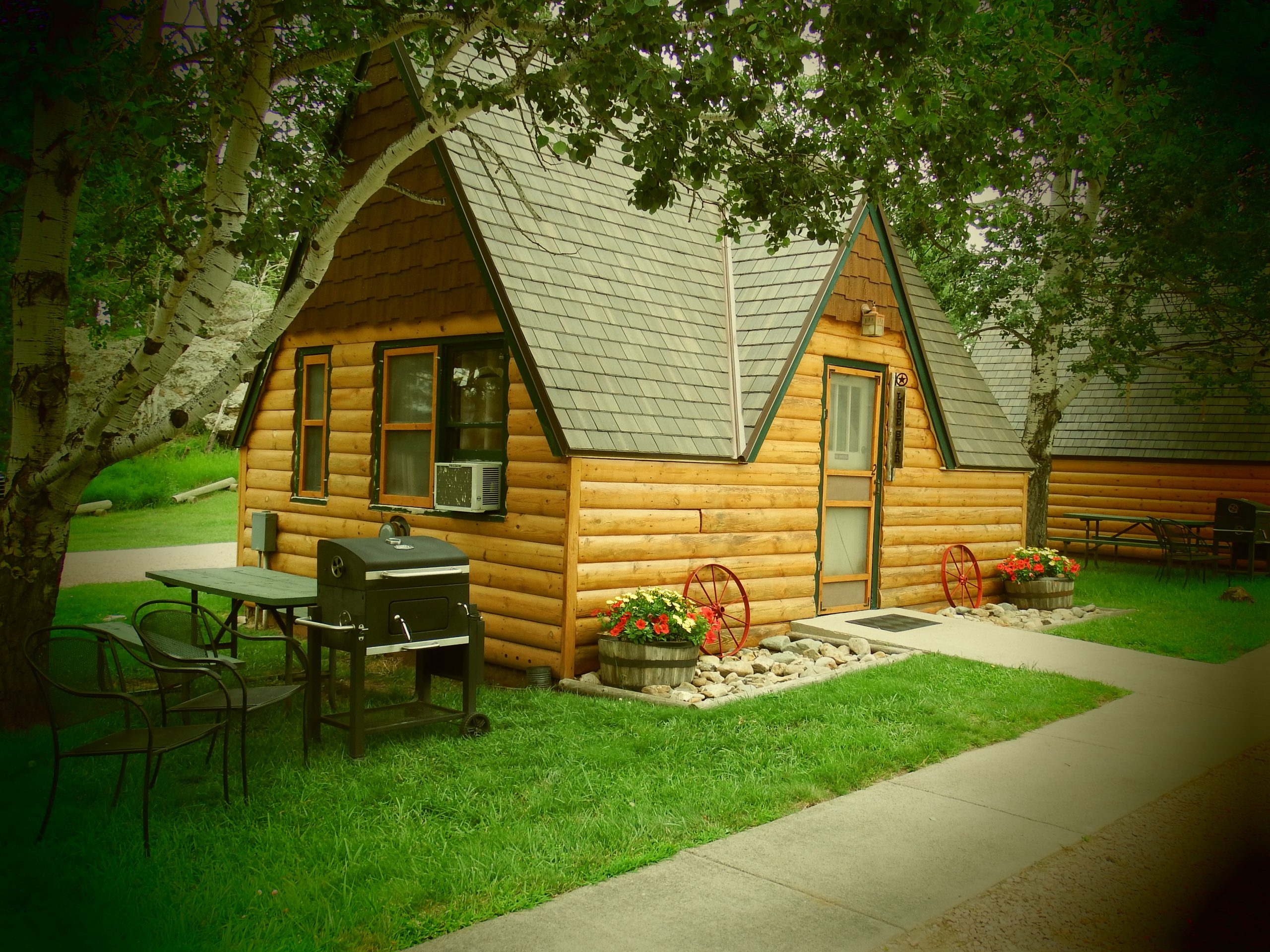 Our Rustic A-Frames, cabins 1 through 7, were constructed in the late 1940’s and early 1950’s. Just like everything in the Black Hills, these cabins have great history. All A-frame roof cabins have heat, air conditioning, color cable TV, WIFI and full baths with shower tub combos, and kitchenettes. Towels and linens are provided. A picnic table, outdoor seating with a charcoal grill are provided with each cabin. There are 4 common area fire pits (3 wood fire, 1 propane) with adirondack chairs for your enjoyment. Daily housekeeping is not provided.  NO PETS..