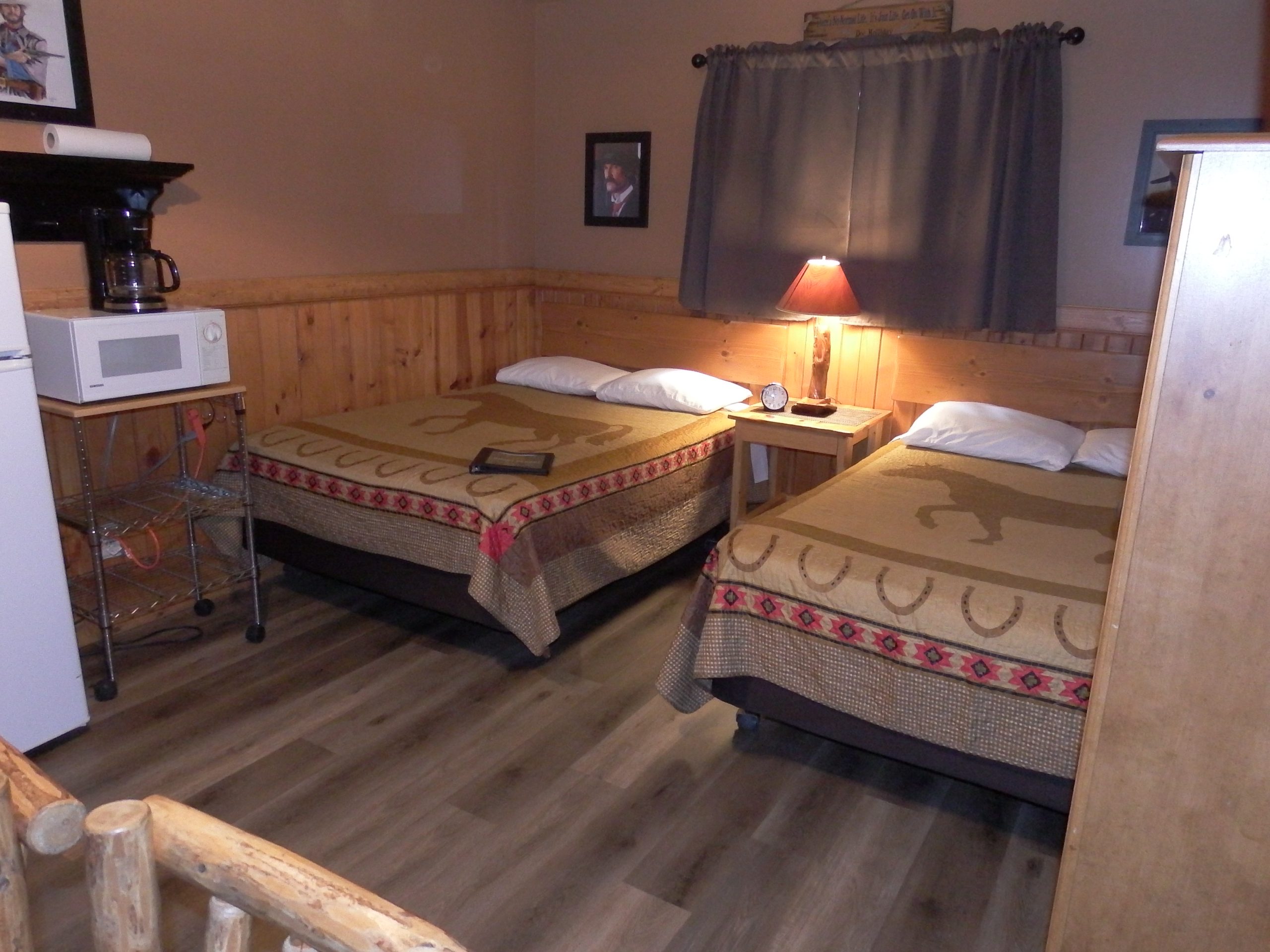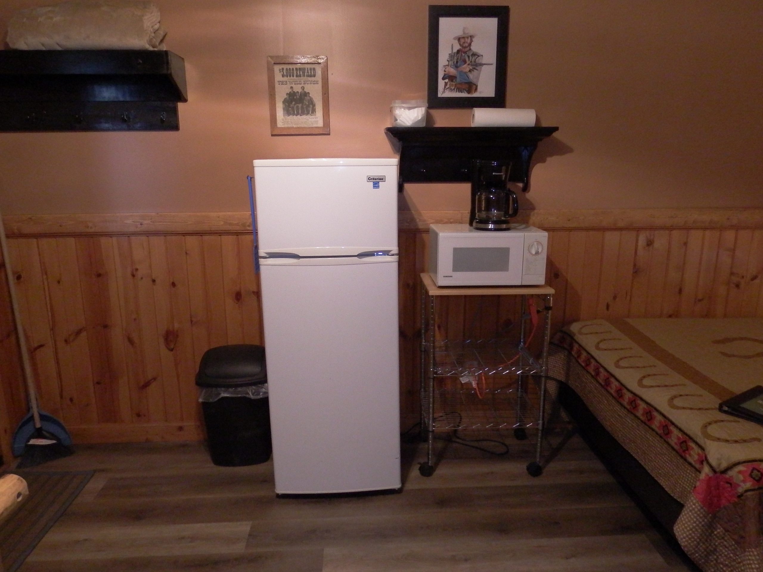This cabin features 1 queen bed.  Kitchenette includes a refrigerator, stove top, sink, toaster, coffee pot, microwave, dishes, utensils, pots/pans.